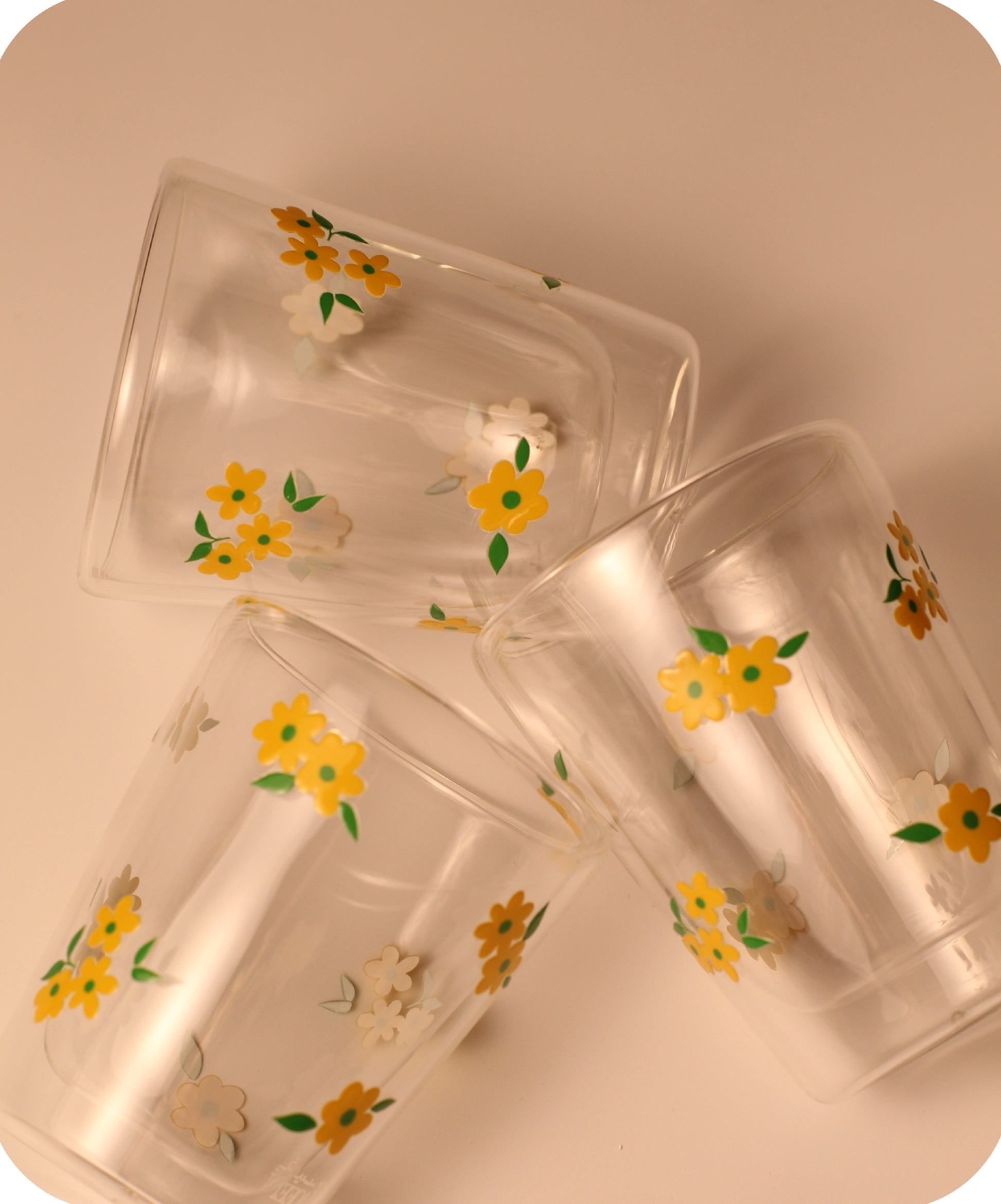 A charming glass mug adorned with yellow flowers and green leaves, adding brightness and joy to your day with every sip. ๐โจ